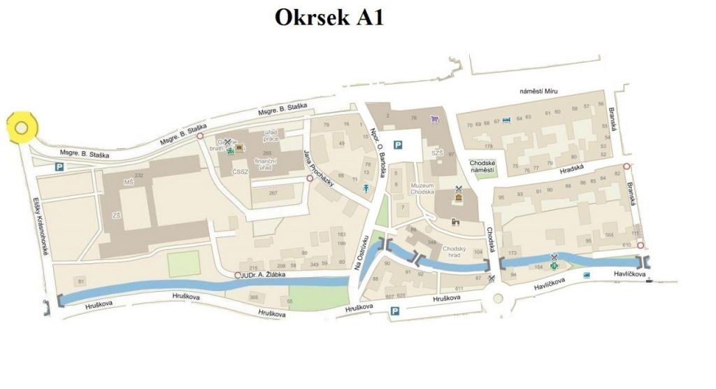 Seznam ulic: nám. Míru (horní jižní část), Chodské nám., Msgre. B. Staška, Jana Procházky, JUDr. A. Žlábka, Na Ostrůvku, Npor. O. Bartoška, Chodská, Branská, Hradská, Hruškova, Elišky Krásnohorské.