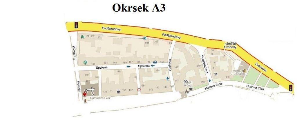 Seznam ulic: nám. Míru (spodní severní část), Spálená, Fastrova, Husova třída, Dukelská, Poděbradova, Kostelní.