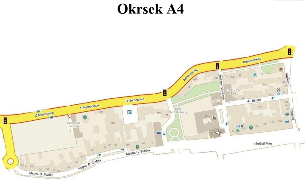 Seznam ulic: nám. Míru (horní severní část), Msgre. B. Staška, Boženy Němcové, Školní, Kostelní, U Nemocnice, Komenského.