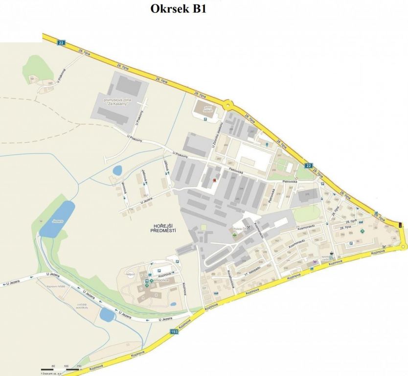 Seznam ulic: 28.října, Kozinova, Petrovická, Kosmonautů, U Pískovny, U Zimního stadionu, Višňová, Habrová, Javorová, U Jezera, Kozinova, Kovařovicova, V Pískovně, 17.listopadu.
