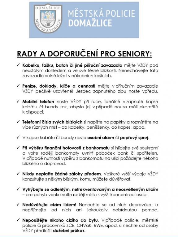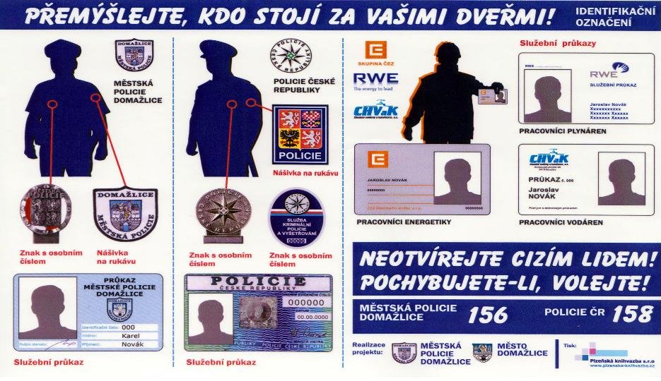 Informativní letáček, který je otištěn v černobílé podobě nad tímto článkem, je tím prvním krokem, který činíme. Jde nám o to, aby senior, který si není jistý, kdo stojí za dveřmi jeho bytu nebo domu, neotvíral a popřemýšlel nad tím, zda by nebylo vhodné si nejprve ověřit, kdo za těmi jeho dveřmi stojí. Naší snahou tedy je pracovat s lidmi tak, aby využívali služeb Městské policie Domažlice, pokud se dostanou do problému nebo si neví rady. Letáček je sestaven tak, aby občan věděl, jak má vypadat strážník Městské policie Domažlice, policista Policie České republiky, pracovník skupiny ČEZ, RWE a společnosti CHVAK. Toto jsou nejčastější skupiny osob, se kterými může přijít občan do styku.