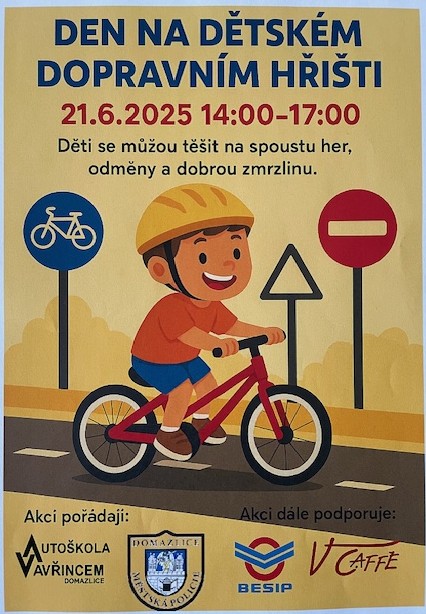 Akce se koná v sobotu dne 21.června 2025 od 14.00 hodin do 17.00 hodin na dětském dopravním hřišti, které se nachází v lokalitě U Jezera (u silnice na Újezd).