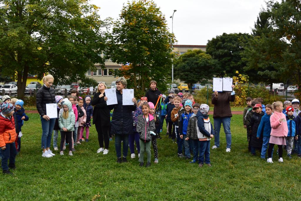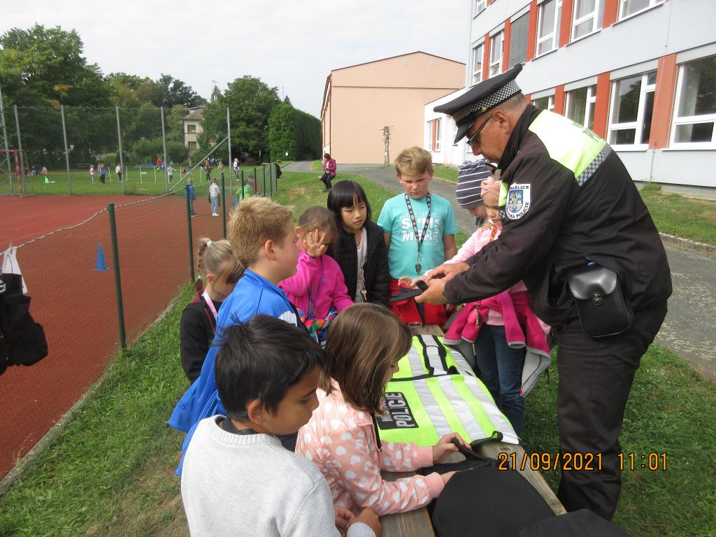 Strážníci Městské policie Domažlice pro žáky 1. a 2. tříd Základní školy Msgre B. Staška uspořádali „Den s městskou policií“. Tato akce proběhla ve dvou termínech koncem září a počátkem října ve venkovních prostorách u základní školy. Strážníci si pro žáky připravili deset stanovišť s různou tématikou. Žáci si mohli vyzkoušet výstroj strážníků, poznávat věci, které strážníci nosí na opasku, dále svoji zručnost vyzkoušeli při jízdě na koloběžce. Hlavy si děti potrápily při hádankách o dopravních prostředcích, rozebraly nebezpečné situace, které byly zobrazeny na obrázcích, prošly si slalomovou dráhu s alkoholovými brýlemi. Žáky rovněž čekalo správné přecházení přes přechod pro chodce, určování dopravních značek, skládání puzzle a „slepý“ semafor. Každá skupinka dětí měla svoji hrací kartu, kam zaznamenávala splněné úkoly. Všechny děti splnily! Za svoji snahu a vědomosti obdržely děti od městské policie reflexní přívěsek a malou sladkost.