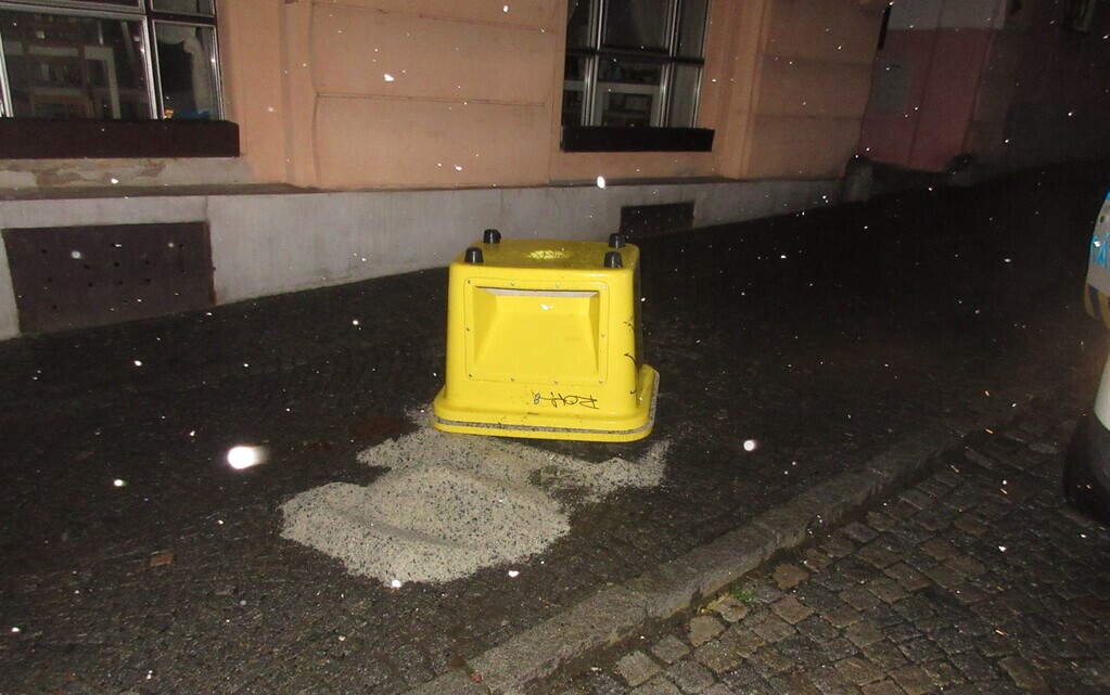 Jeden z mužů najednou skočil na přední kapotu zde zaparkovaného motorového vozidla zn. Škoda Octavia. Operátorka MDKS vyrozuměla motohlídku MP, která v té době prováděla kontrolu města, a nadále sledovala dvojici. Muži prošli přes ulici Hradská do ulice Branská, kde jeden z mužů povalil kontejner na posypovou sůl. Poté společně pokračovali do ulice Kostelní a zastavili se v ulici Poděbradova před provozovnou Peeter´s Pub. Zde je hlídka MP dostihla a oba muže vyzvala k prokázání totožnosti. Jeden z mužů se strážníkům doznal, že skočil na vozidlo. Po provedení kontroly vozidla zn. Škoda Octavia bylo zjištěno poškození kapoty. Na kontejneru na posypovou sůl žádná škoda nevznikla. Vzhledem ke zjištěným skutečnostem byla na místo přivolána hlídka OO PČR Domažlice, která si celou událost od hlídky MP převzala.