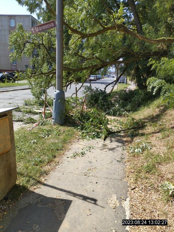 Místo strážníci vyznačili páskou tak, aby nedošlo k žádné újmě na zdraví nebo na majetku. Následující den dopoledne pracovníci technických služeb spadlý strom odstranili a místo bylo zase průjezdné i průchodné bez omezení. Ve čtvrtek hlídka MP prováděla kontrolu města a zjistila, že na stejném místě v Mánesově ulici je opět spadlý strom, který zatarasil celý chodník a částečně i ulici. Přivolaní pracovníci Domažlických technických služeb obratem spadlý strom odstranili z vozovky i z chodníku. Místo zeleně bude řádně prohlédnuto, aby se zjistila příčina padlých stromů.