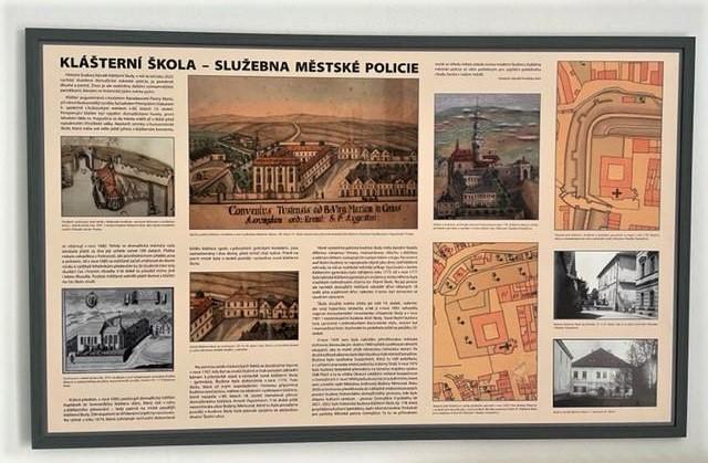 Občané města, ale i jeho návštěvníci, kteří si v budově uschovávají svá jízdní kola, si na něm můžou přečíst informace o bohaté historii budovy bývalé klášterní školy. V průběhu dějin sloužila budova nejen pro účely školy, ale v roce 1939 sem byla nakrátko přestěhována městská knihovna, po druhé světové válce byla využívána Svazarmem. Po roce 1975 bylo v budově zřízeno Okresní oddělení veřejné bezpečnosti a po jejím vrácení městu byla zde v roce 1994 umístěna Městská knihovna Boženy Němcové. Po přestěhování knihovny do domažlického pivovaru započala rekonstrukce budovy na moderní služebnu Městské policie Domažlice.