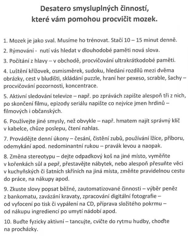 Lektorka seniory seznámila nejen s fungováním naší paměti, jejím procvičováním, ale postupně rozdávala i malé úkoly, které senioři plnili. Všichni účastníci si zapamatovali, že náš mozek funguje podobně jako sval a když jej nebudeme trénovat, postupně zakrní. Proto bychom si měli najít alespoň pár minut denně, kdy paměť aktivně zapojíme.